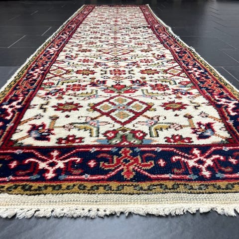 Oprindelse: Indien; håndknyttet orientalsk tæppe af uld på bomuld, 165 × 90 cm, fra midten af det 20. århundrede, i god generel Stand. Klik på den blå "gå til varen" knap, for at købe eller byde på denne vare. Den samlede pris vil blive vist inden du afgiver dit bud.