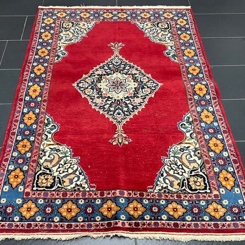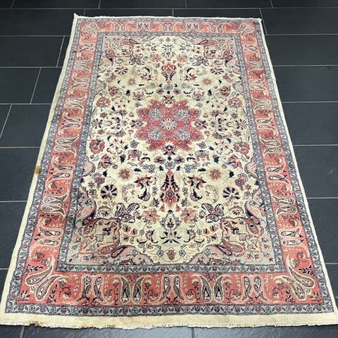 Oprindelse Pakistan, model Feiner Ghoum, håndknyttet orientalsk tæppe, uld på bomuld, størrelse 125 × 80 cm, midten af det 20. århundrede, i god generel stand med alders- og brugsspor. Klik på den blå "gå til varen" knap, for at købe eller byde på denne vare. Den samlede pris vil blive vist inden du afgiver dit bud.