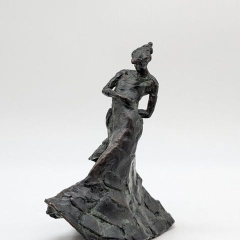 Stilen er figurativ og modernistisk, med en finish, der imiterer ældet guld eller bronze.