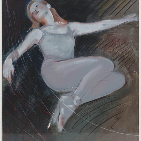 Værket skildrer en nøgen kvindefigur i en danseposition, med armene løftet over hovedet.