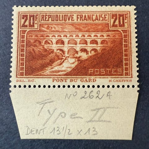 Frankrig 1929 - N° 262B, 'Pont de Gard' tandet 11, meget letstemplede, unders...