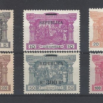 Portugal, Vasco da Gama 1. serie, fra 1898, Mundifil 148/155, ny uden gum. Klik på den blå "gå til varen" knap, for at købe eller byde på denne vare. Den samlede pris vil blive vist inden du afgiver dit bud.