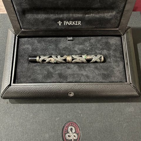 Parker Duofold Presidential Esparto kuglepen i massivt .925 sølv, oprindelse Storbritannien, dateret til anden halvdel af det 20. århundrede, i næsten ny tilstand og i funktionel stand, leveret med trææske, kontroæske, original garanti og refill. Klik på den blå "gå til varen" knap, for at købe eller byde på denne vare. Den samlede pris vil blive vist inden du afgiver dit bud.