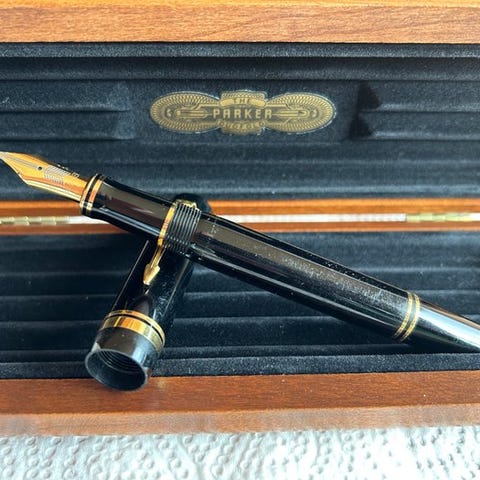 Parker Duofold Presidential Esparto kuglepen i massivt sølv, ny og komplet med trææske, indre æske, originalgaranti, refill.
