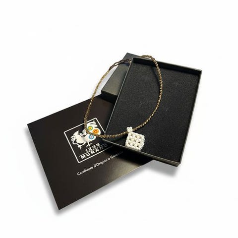 Perlerne er pyntet med farverige murriner, autentiske mikrokompositioner i glas, som skaber elegante blomster- og geometriske motiver, et symbol på den historiske muranske tradition.