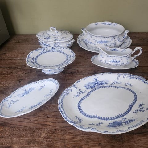 Vajilla fra Ridgways (Staffordshire), dekoreret med motivet 'MING' i blå calque, med rige, meget detaljerede kanter. Fremstillet i England i slutningen af det 19. århundrede, blev Ridgways et af de mest prestigefyldte producenter og eksporterede sin porcelæn til Europas fineste borde. Denne model, kaldet Royal Semi Porcelain, blev distribueret i Frankrig af de prestigefyldte huse og stormagasiner som E. Bourgeois, Grands Dépôts (Paris), et referencepunkt hvor de raffinerede parisere købte de bedste services fra Belle Époque og tidligere.