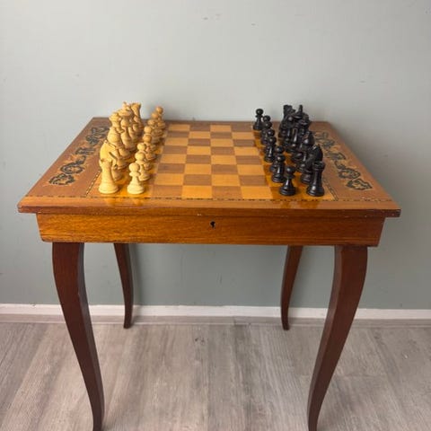 Italiensk Savonarola-stolesæt med roterende skakbord i massivt træ, fra 1940–1950, i god stand. Klik på den blå "gå til varen" knap, for at købe eller byde på denne vare. Den samlede pris vil blive vist inden du afgiver dit bud.