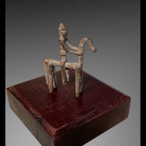 Magnifique Cavalier en Bronze Dogon, en bronze Dogon‑rytter fra Mali fra midten af det 20. århundrede, provenance Collection privée, 13 cm høj, 10 cm bred, 3 cm dyb, 230 g, leveret med stand, i fremragende stand. Klik på den blå "gå til varen" knap, for at købe eller byde på denne vare. Den samlede pris vil blive vist inden du afgiver dit bud.