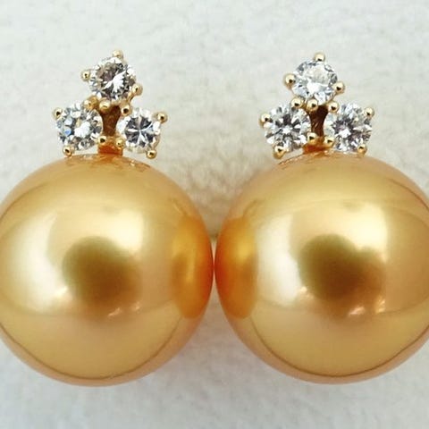 Øreringe - 18 kraat Gulguld, Store runde australske South Sea-perler. Diamant...