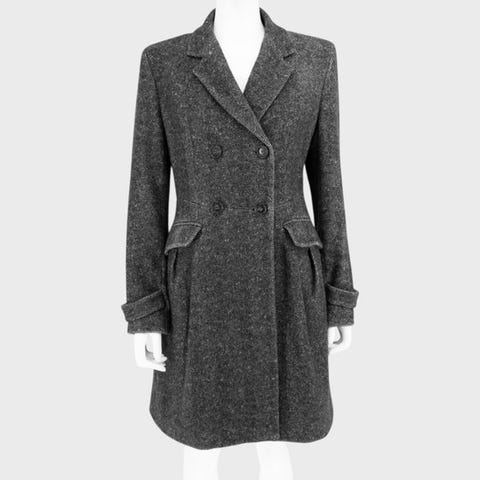 Max Mara - Virgin Wool & Cashmere grå lammeuld frakke til kvinder, størrelse US 8 / DE 38 / FR 40 / IT 42, fremstillet i Italien af 80% virgin wool og 20% cashmere med 100% viskosefutter, i meget god stand med minimale slidsspor. Klik på den blå "gå til varen" knap, for at købe eller byde på denne vare. Den samlede pris vil blive vist inden du afgiver dit bud.