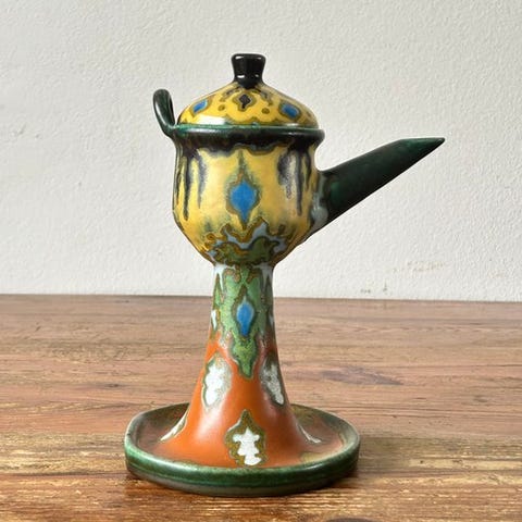 En sjælden, polykrom bordlampe med original skærm fra De Porceleyne Fles.