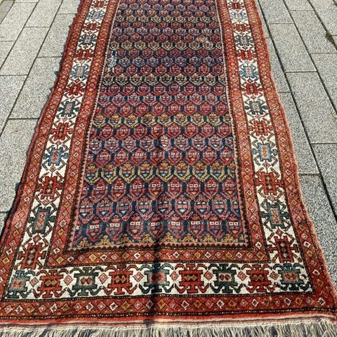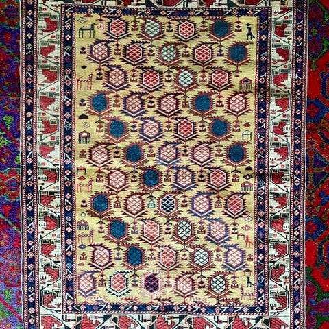 Beskrivelse og oprindelse: Kaukasisk tæppe med forenklede mønstre, der kan tilskrives Gendje, Shirvan-Baku og Kuba-tæpper. Fremragende kvalitet og skinnende uld. Dybe blå, brune, pink og gule farver.