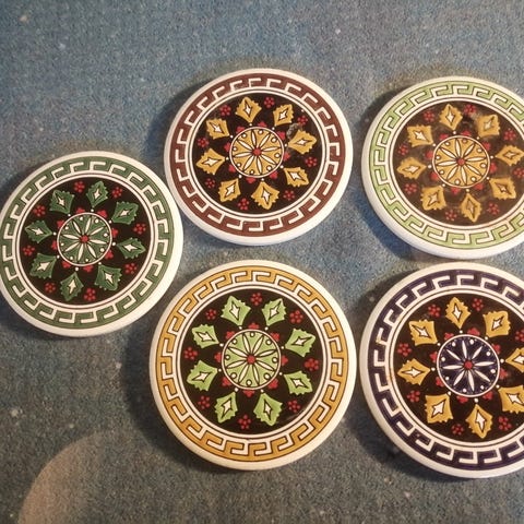 6 Smukke Egyptiske Coastere I læder med Egyptiske guder I guldsnit. Og med den Originale holder til coasterne også I læder.