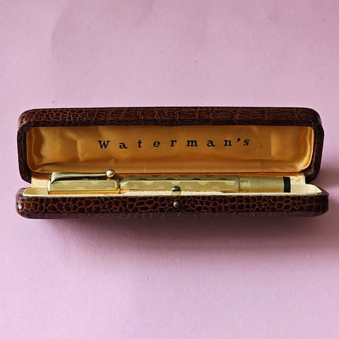 Waterman’s 52 1/2 V sæt bestående af fyldepen og matchende blyant i Red Ripple / Woodgrain, fremstillet af resin/polyester med forgyldte metaldele, to dele, længde 106 mm og diameter 9,5 mm, i god brugt stand og i funktion. Klik på den blå "gå til varen" knap, for at købe eller byde på denne vare. Den samlede pris vil blive vist inden du afgiver dit bud.
