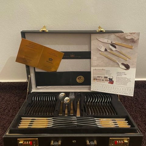 Bestik til bordet i sølvbelagt metal, i fremragende stand, fra Maison Boulenger, model 'Filet', som inkluderer: