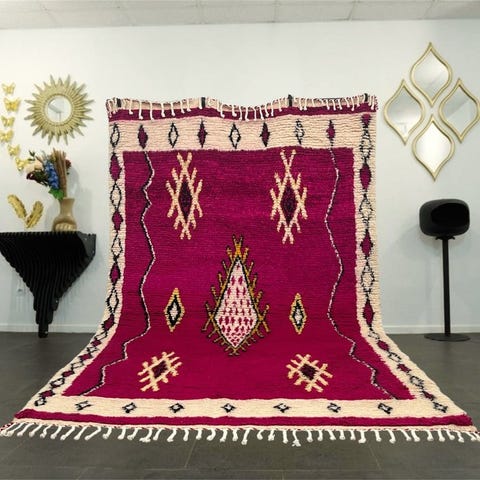 Azilal-teppicher er kendt for deres ægthed og fængslende mønstre, der er gennemsyret af symbolske stammer, som fortæller om århundredes berbisk traditioner. Hvert stykke er unikt, pyntet med fine frynser og vævede mønstre med omhu. Dette teppe