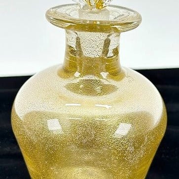 Udført med mesterlighed gennem de traditionelle muranske teknikker zanfirico og latticino, adskiller denne parfume flaske sig ved sit enestående lodrette stribemønster, der fremviser en netlignende tekstur inde i de hvide sektioner, hvilket forstærker dens skønhed.