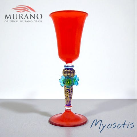 Glasset præsenterer en raffineret blomsterdekoration håndmalet med guldapplikationer, på en rubinrød bund med gyldne nuancer, typiske for Murano-kunsthåndværk i højeste kvalitet. Gennem tre brændinger opnås dybde, glans og en markant farverigdom i glasset.