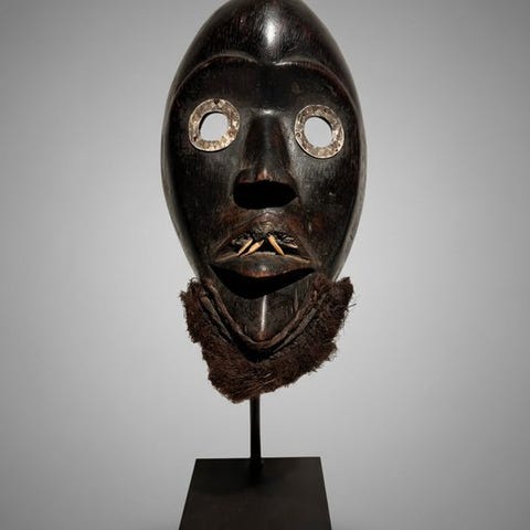 Pende træmaske fra Congo, anslået periode 1930–1950, 52 cm høj og 15 cm bred, i god stand med aldersrelaterede slidmærker, provenance belgisk privat samling, sælges med ægthedscertifikat. Klik på den blå "gå til varen" knap, for at købe eller byde på denne vare. Den samlede pris vil blive vist inden du afgiver dit bud.