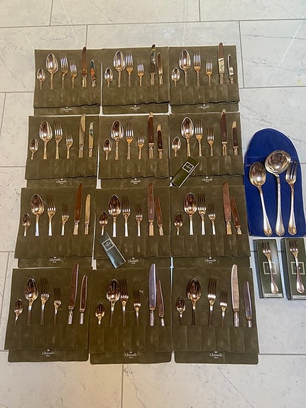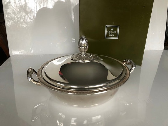 Indeni er æsken samt indlægsskiven med opdelte rum helt foret med et flot mønstret papir.