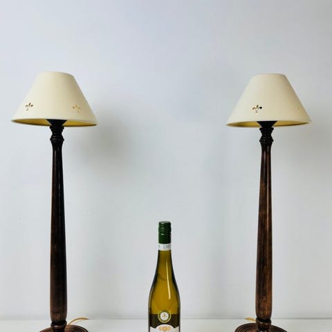 To krom-kandelaber bordlamper af aluminium, fra 1980–1990, i god stand med mindre brugsspor, højde 88 cm, fod 12×12 cm, skærme 22×33 cm, E27 fatning med kontakt. Klik på den blå "gå til varen" knap, for at købe eller byde på denne vare. Den samlede pris vil blive vist inden du afgiver dit bud.