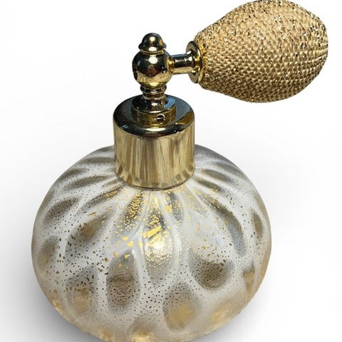 Kunstnerisk parfume-flakon i ægte Murano-glas med murrine og 24 kt guldblad, helt håndlavet efter traditionelle teknikker for varmforarbejdning.