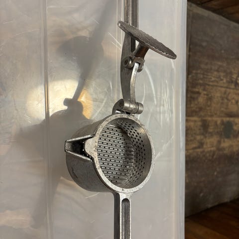 Antikt citruspresser med hydraulisk tryk, produceret i 1950'erne, mærke Regina, med mærkning Made in Germany. Objektet er kompakt, men ekstremt solidt, designet til daglig hjemme- og professionel brug, og er i dag eftertragtet som et moderne samlerobjekt til køkkenet og vintage værktøj.