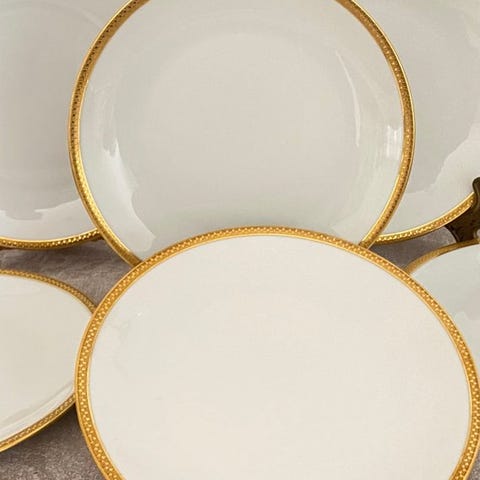 Et udsøgt Haviland & Co. Limoges desserttallerkenesæt, smukt dekoreret med raffinerede Art Nouveau blomstermotiver og rig håndpåført guldbelægning, der repræsenterer de højeste standarder inden for tidlig fransk porcelænskunst.