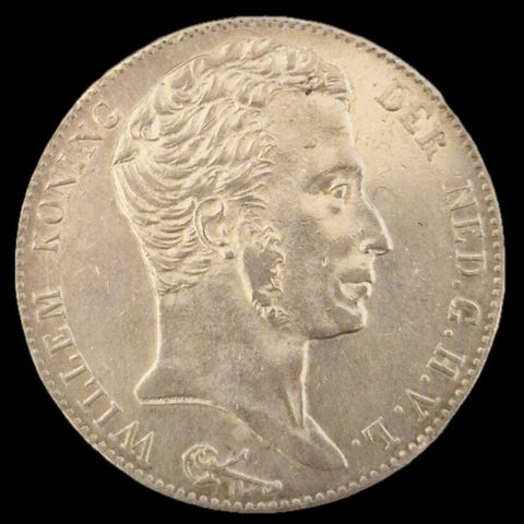 Sølvmønt på 2,5 gylden fra 1857, Nederlandene, portræt af Willem III, sølv 945/1000, vægt 25 g, diameter 38 mm, tykkelse 2,5 mm, ikke certificeret. Klik på den blå "gå til varen" knap, for at købe eller byde på denne vare. Den samlede pris vil blive vist inden du afgiver dit bud.