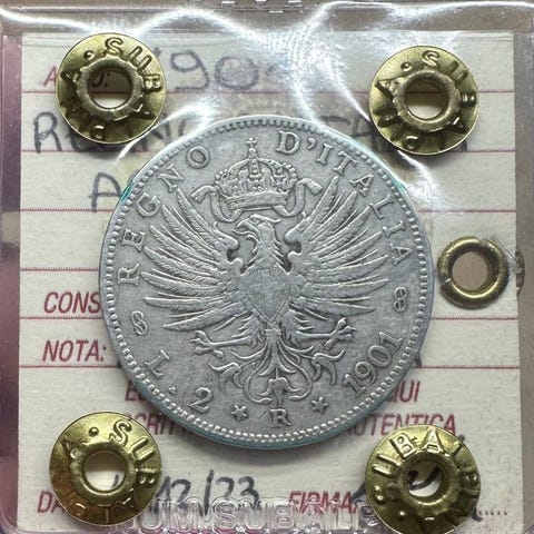 2 Lire – Firenze, 1860, under den Provisoriske regering af Toscana, støbt i sølv med portræt af Vittorio Emanuele II 'Re Eletto' på forsiden, et kors- og kronet våbenskjold med Annunziata-kæden, mellem de to laurbærgrene på bagsiden.