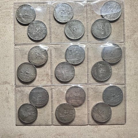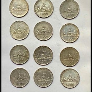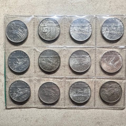 Et lot på 10 sølvfarvede 500 lire mønter fra Italien med karaveller, verdensmønter-emne, ikke gradering. Klik på den blå "gå til varen" knap, for at købe eller byde på denne vare. Den samlede pris vil blive vist inden du afgiver dit bud.