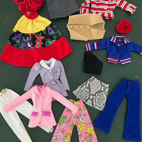 Francie-tøj, Barbiens engelske kusine, og et body fra Christie, Barbies veninde, 1960’erne (se mærkater)