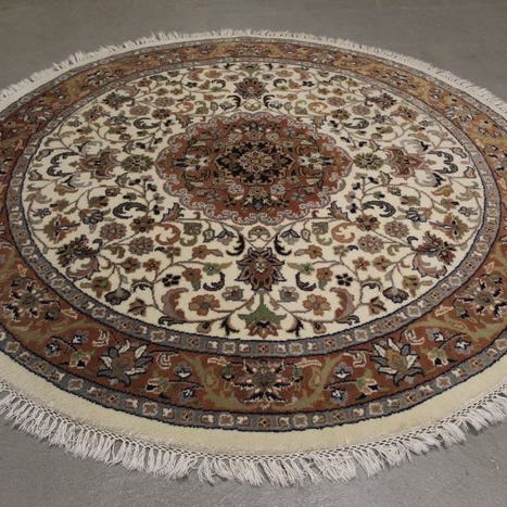 Smukt håndknyttet tæppe af uld. Katoenen er naturligt farvet uden kemikalier. Hovedfarverne er rød, creme, blå og grøn. Tæppet er med smuk, professionel, stram knytning og har korte frynser.