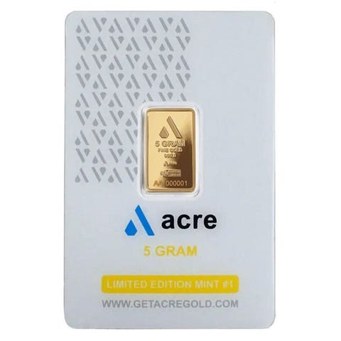 Acre Alpine Collection 2,5-grams guldbar er lavet af det fineste (.9999 ren) 24-karat guld. Baren har Acre-logo, PAMP-myntmærke samt vægt og renhed på bagsiden. Alle barrer leveres i testemballage med en forseglingsbeskyttelse og et unikt serienummer. På grund af gulds økonomiske stabilitet er denne bar en fremragende investering til diversificering af porteføljen.