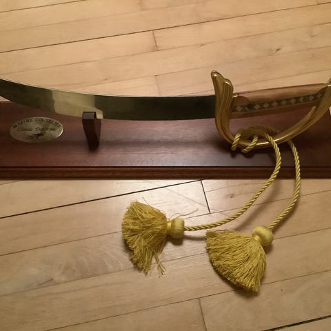 Smuk champagne-sabel i metal, træ og messing, fra det berømte franske mærke Roger Orfèvre med sin røde Lamière, i god stand med nogle aldersmærker (se billeder).