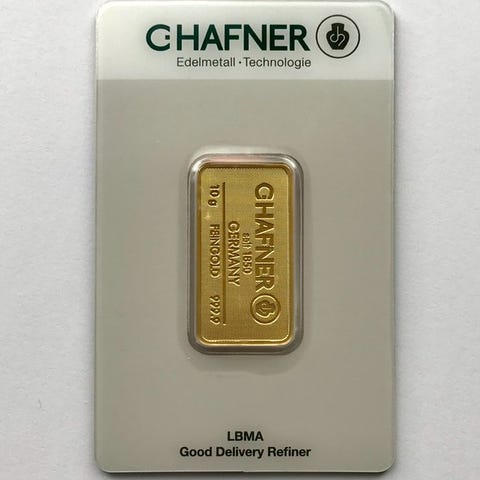 De prægede Heraeus guldbarrer leveres i et blisterkort