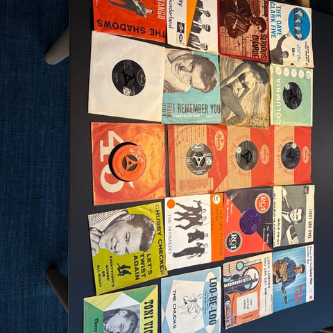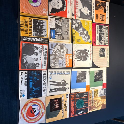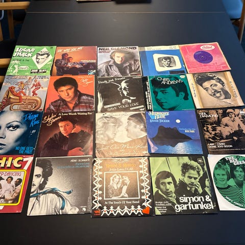 5 gamle vinylplader i forskellige omslag. Indeholder forskellige musikgenrer og kunstnere. Pladerne er beregnet til afspilning på grammofon eller pladespiller.