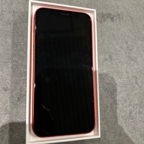 Apple iPhone 12 smartphone med 64 GB lagerplads i sort farve. Enheden har en flad kantdesign og glas på forsiden og bagsiden. Telefonen har brugsspor, herunder ridser på skærmen og bagsiden, samt slid på kanterne. Enheden er uden yderligere tilbehør.