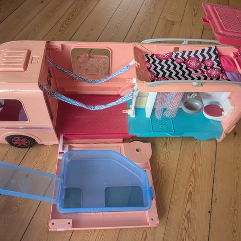 Barbie Dream autocamper med masse af tilbehør, herunder Barbie dukker, tøj, kuffert, køkkenudstyr og møbler. Bussen har vinduer og plads til leg og opbevaring af medfølgende dele samt rutchebane og pool.