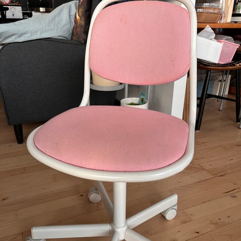 IKEA børnestol med lyserød polstring og hvid stel. Stolen har hjul og er designet til børn.
