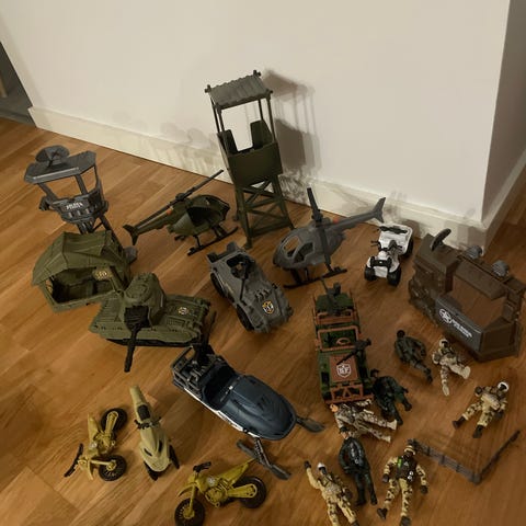 Sæt bestående af forskellige legetøjsmilitærkøretøjer og figurer i forskellige størrelser og farver. Sættet inkluderer helikoptere, kampvogne, fly, både og soldaterfigurer. Materialet er plastik, og farverne er primært grøn, grå og camouflage. Velegnet til leg og samling.