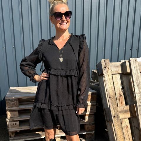 Flot kjole i leopard print. Kjolen har lange lidt puffede ærmer, der afsluttes med smock. Der er slids i begge sider og en lille åbning i nakken, der lukkes med en knappe. BM ca. 2x48 cm og længden målt fra nakken og ned ca. 120 cm 🌸