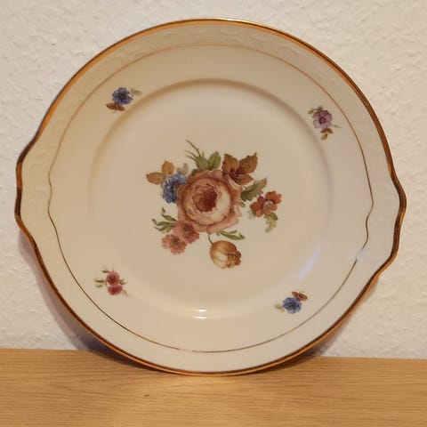Bing & Grøndahl Malton oval tallerken med en diameter på 46 x 26 cm. Tallerkenen er lavet af porcelæn og har en dekorativ blomstermotiv samt en kant med guldkant.