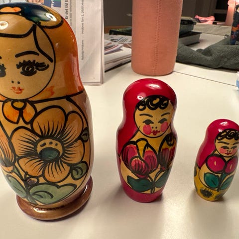Russiske trædukker Matryoshka i forskellige størrelser. Dukkerne er malet i sort med farverige blomsterdetaljer. Materialet er træ.