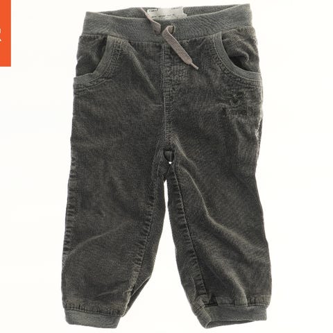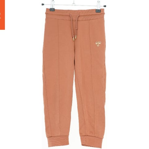 Bukser med beige og blå striber. De har en elastisk talje og to sidelommer.