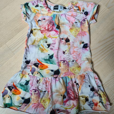 Camellia Cockatoo Kortærmet jerseykjole i bomuldmix med molo's unikke, digitale all over print 'Cockatoo'. Kjolen har et regulært til løst fit, en fin rynkedetalje foran ved halsen samt let puf i ærmerne. Dette produkt er Oeko-Tex certificeret