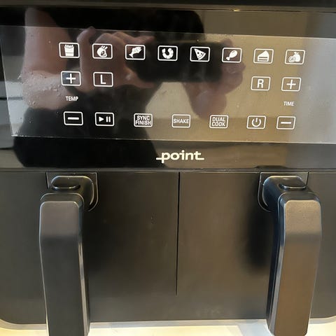 Tower Airfryer i sort farve med justerbare kontroller på fronten. Den er designet til sundere madlavning ved hjælp af luft i stedet for olie. Airfryeren har en aftagelig skuffe med en perforeret bakke til madlavning, og en ledning til strømtilslutning. Den måler 30 cm og har et rundt design.