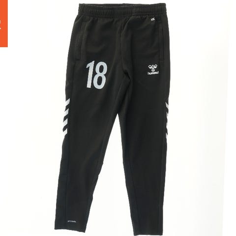 Et par sorte træningsbukser fra Hummel. Bukserne har sidelommer og en elastisk talje. Nederst på benene er der et mønster med skrå striber.