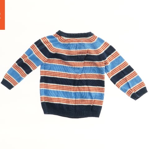 Trøje med lange ærmer og ribbet textur. Trøjen har horisontale striber i grøn og beige. Foran er der en kort knaplukning med tre knapper.