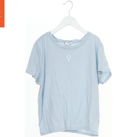 Jeans med vidde ben i en blå denimfarve. Bukserne har to forlommer og to baglommer. Der er en knap og lynlås foran til lukning. Brandets navnemærke er synligt på bagsiden nær linningen.